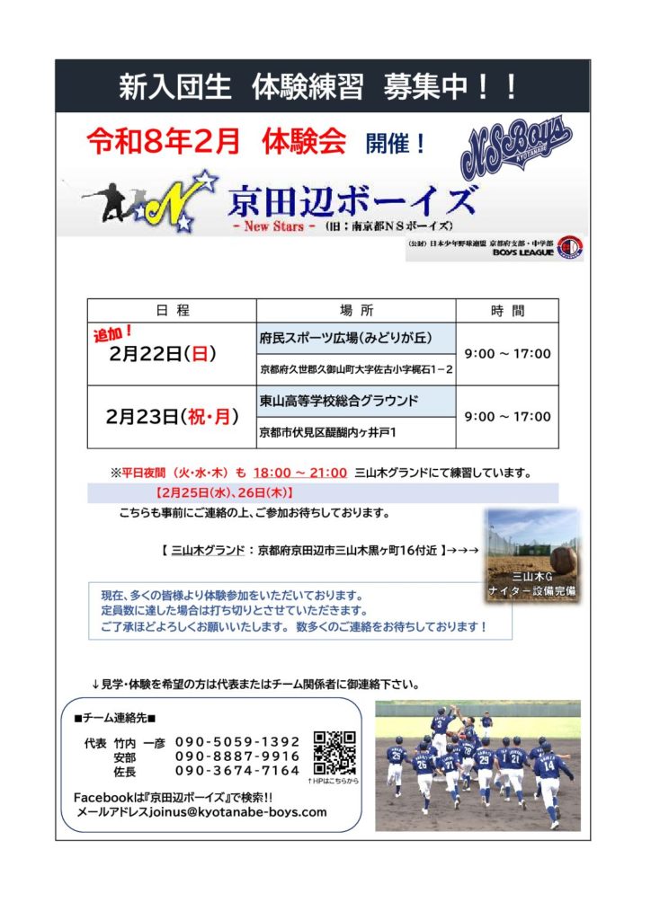 ぜひ実際の練習に参加して京田辺ボーイズの野球を体感してみてください。